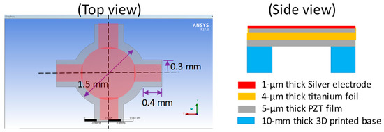 There were two main design concepts involved in the construction of the proposed PMUT. One was the foil containing the piezoelectric element and the other was the PMUT base, which was utilized to determine the vibrational area of the PMUT. In addition, the design consideration had two aspects: (1) The active foil was designed as a large circular geometry with four beams connected to the anchor region. Compared to a common four-edge anchored square membrane, this design allowed for the active membrane to possess a larger displacement through its less-fixed boundary condition. (2) Considering this prototype design was manually assembled onto the 3D printed base and setting the center of circular foil was done in alignment with the opening center of 3D printed base, we thus designed the entire structural foil to be approximately 2 mm × 2 mm for relatively easy implementation in this study.
