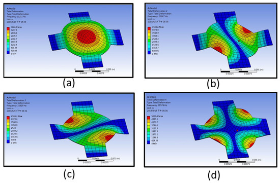 The first four resonant frequencies were 11.211, 22.627, 22.629, and 31.576 kHz. The corresponding mode shapes are displayed in Figure 2a–d. The maximum displacement of the first resonance occurred at the center of the structure. The second and third mode shapes exhibited a phenomenon of maximum displacement, which occurred at two different edges of the opposite quarter-circle of the designed PMUT. Ideally, due to the symmetry, the frequency of the second and third mode should be identical, hence it is possible to view the minor difference as a numerical error. However, in a practical test or operation, several situations might lead to less than ideal results. For instance, the fabricated PMUT membrane might not be perfectly symmetric, causing a frequency splitting of the two resonances [30]. The amplitudes of each resonance also depend on the effective location of the excitation. The fourth mode shape occurred at a single frequency. The ensuing mode shape was supposed to be relatively stable during the operation.