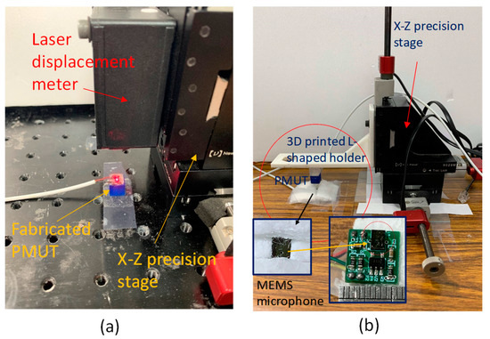 The range-finding experiment was executed as follows (Figure 5b). An L-shaped 3D printed holder was anchored on the sidewall of a XZ precision stage. The stage was produced by Newport Corp. (Irvine, CA, USA); its motion could be controlled using a computer with a piezoelectric actuation mechanism. Its travel resolution was 20 nm and the maximum stroke was 3 cm. The fabricated PMUT was anchored at the bottom of the L-shaped structure. A spacer was attached to the base of the PMUT such that the initial distance between the piezoelectric foil of the PMUT and the sound hole of the MEMS microphone was set at 5 mm.