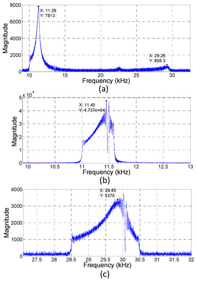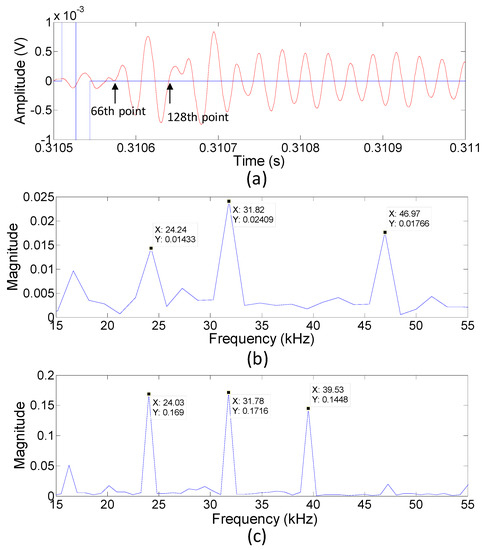 It was significant that if the processed signal in Figure 9a was taken at 66 successive points, ranging from the starting moment of the input signal and examined at its dominant frequency, it was found that the frequency had some peaks, in which 24.24, 31.82, and 46.97 kHz were approximately three to five times beyond the noise level. However, if 128 points of processed signal were chosen from the beginning of the input signal, strong peaks with much better signal-to-noise ratio were observed at 24.03, 31.78, and 39.53 kHz (Figure 9b,c). The two peak frequencies of approximately 24.03 and 31.78 kHz were significant in this study because the former was related to the fundamental resonance of the microphone membrane and the latter could be considered to be caused by the PMUT input signal. The appearance of the fundamental resonance could also be attributed to the excitation frequency of the input signal, which was still within the resonance band.