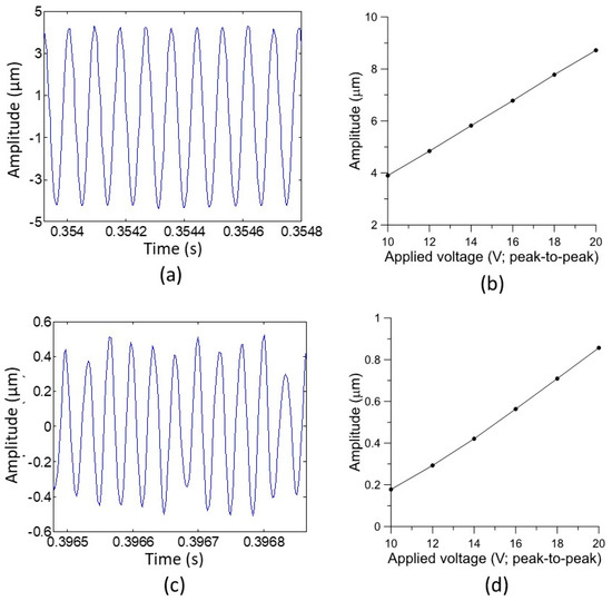 The resonances were found experimentally through the frequency response of the fabricated PMUT. A significant property of the PMUT was the maximum displacement normal to the surface at its operation resonance. Figure 7a shows the displacement of the PMUT operated at 11.45 kHz with a driving sinusoid wave of 20 V peak-to-peak. This displacement result was obtained with the acquired signal from the laser displacement meter after processing with a second-order Butterworth bandpass filter. The center frequency was set at 11.45 kHz and the cutoff frequencies were 1.045 and 21.45 kHz. The maximum displacement achieved was approximately 8.6 µm. Using a similar signal-processing method, the displacements of the PMUT were measured with different input actuation voltages. Figure 7b exhibits the linear trend of maximum displacements from 10 to 20 Vpp. For an increment of 1 Vpp, the displacement was about 0.24 µm.