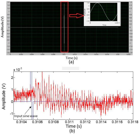 The designed single waveform of the input signal to actuate the PMUT is shown in Figure 8a. A 29,411 Hz sinusoidal wave was created using 34 points and a sampling rate of 1 MHz was used. Two DC signals, each of 0 V and duration of 0.01 s (104 points at a sampling rate of 1 MHz), were added to the front end and backend points of the sine wave. Although the result of the characterization of the developed PMUT was 29.85 kHz for the fourth resonance operation, the practical operating frequency of a digital signal given by the experimental setup for delineating a sine wave was limited. This was because of the synchronous setting of the DAQ card for analog-to-digital and digital-to-analog conversions with an identical sampling rate of 1 MHz. Therefore, if 33 or 35 points were used with an interval of 10−6 s between any two neighboring points to define the sine wave, the resulting frequency would be 30.303 or 28.571 kHz, respectively. In comparison, the frequency value deviating from 29.85, 30.303, and 28.571 kHz were larger than 29.411 kHz. Hence, 34 points were set to generate the digital sine wave for testing.
