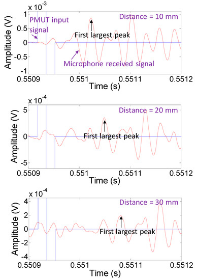 While the PMUT emitted ultrasonic waves, electrical excitation was provided by repeatedly sending the designed single waveform as a continuous signal. Figure 8b shows the acquired signal from the microphone module without any data processing, at a distance of 10 mm away from the PMUT. The received ultrasonic waveform from the microphone module could be easily monitored behind the sine wave excitation.