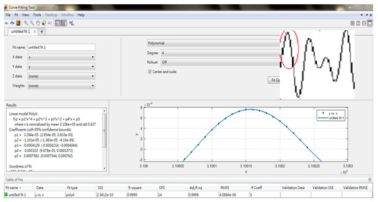 Figure 10 presents the results of the measured data for different distances after the bandpass filter processing. We tried to find the largest peak time of the wave to perform the analysis. Since the data points might not be located at the exact peak position of the wave, a curve-fitting method was utilized to find the peak time (Figure 11). The points of the first wave with positive amplitudes was employed to fit a fourth-order polynomial curve. A maximum y-coordinate (ya) and a corresponding x-coordinate (xa) of the curve could be obtained by differentiating the fourth-order polynomial and setting it to zero. xa was related to the travel time from the PMUT to the microphone, which allowed for evaluation of the distance between the PMUT and the microphone. ya represents the amplitude of the acquired signal at a fixed strength of the input signal. xa and ya were the two features used for range finding.