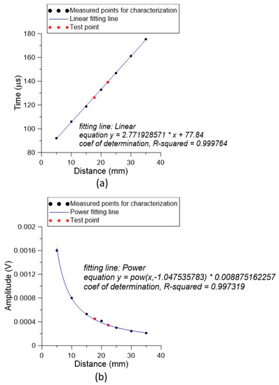 We characterized the maximum service range of the designed PMUT up to 35 mm. That is, using the proposed PMUT–microphone–DAQ system, the testing range within 35 mm could be identified using the calibration curve shown in Figure 11. Finally, two arbitrary distances of 17.75 and 22.26 mm were set. The two distance points were substituted into Equations (1) and (2) to derive time values of 126.239 and 139.072 μs, and strengths of 449.6 and 344.4 μV, respectively. The results were compared with the two distance test points by directly substituting them into the fitting equations. The data showed that the respective errors were 0.63% and 0.34% for the time-of-flight method, and 3.10% and 0.10% for the strength variation method.