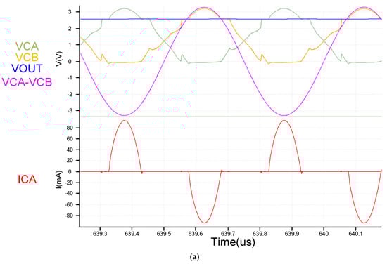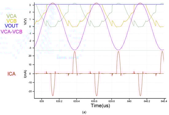 From Figure 17a, we see that both the architectures use the same active diode. The architecture is fast, and this result is also reflected in the ICA current in Figure 17a. Also worth noting in Figure 17b is that the two architectures have very different VCE and PCE performances at voltages below 2.7 V. This is mainly because the previously mentioned VCB + VCB voltage of the proposed circuit is sufficiently high to fully utilize circuit performance. However, the proposed circuit offers certain advantages. With Figure 17a,b showing VAC voltages exceeding 2.7 V.