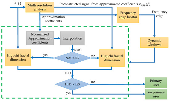 First, it is presented a short summary of the technique developed by the authors in [10]. Basically, this original methodology considers the multiresolution analysis (a wavelet-based dyadic filter bank) and the Higuchi fractal dimension to detect transmissions of PUs. The flowchart of the implemented methodology of this previous work is described in Figure 2 where represents the power spectral density in a wide frequency range or the received multiband spectrum by a SU.