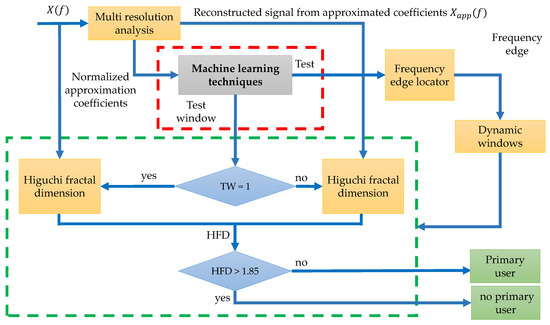 Figure 3 shows the introduction of this new block, and the red dashed line points out the place for ML techniques. All techniques, described in Section 2, are implemented in this block. As a result, the frequency edges are improved and a Test window (TW) is used to determine the presence or absence of PUs instead of NAC directly (Step 5 also marked by a dashed red line).