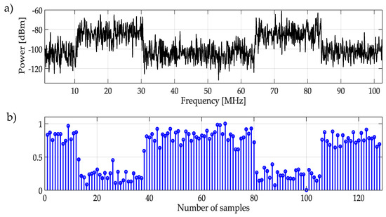 First, the NN is trained based on a single frame from the whole wideband spectrum, i.e., and its MRA. The considered frame for training is chosen randomly but must contain one or more PU transmission. Figure 5a shows an example of the signal used for the NN training, while Figure 5b represents the normalized and rescaled approximation coefficients, obtained from the MRA that will be used to train the NN. This step provides to the NN, information about frequency band appearance with and without PUs activities. To separate both classes (PUs or SUs), it is necessary to set an initial threshold before NN training. A manual threshold was initially proposed, but this means that the threshold setting will depend on the criteria of an external user, making the process extremely unpredictable. However, for a signal with a large difference among coefficients (low noise), the threshold setting is not a big deal.
