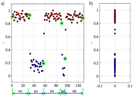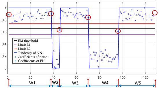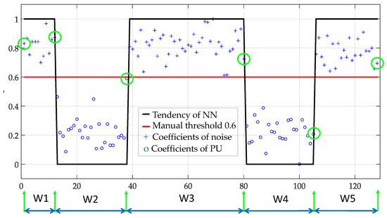 In Figure 6, the user set the threshold at 0.6, and the NN was trained. In this figure, according to this manual threshold, the approximation coefficients were classified and represented with 1 for noise and 0 for PUs, identifying correctly the PUs presence. Thus, the trend of coefficients is clear and helps, besides to separate both classes, to determine the frequency edges of a PU transmission. This occurs when a change is present from a coefficient associated to noise and the immediately next is a coefficient associated to a PU (or vice versa), as can be shown by the green circles in Figure 6. These values (green circles) will permit to construct the dynamic windows (marked as W1,…,W5 in this case) that will be further processed individually to determine if the signal segment corresponds or not to a PU.