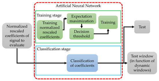 | Step 3. | A training frame is selected: the approximation coefficients are normalized and rescaled. These coefficients are used to train the NN where coefficients will be classified and two limits ( and ) estimated by the EM algorithm. Then, a random value between and is selected as threshold. |