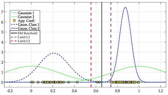 In Figure 10 the application of the EM algorithm is exemplified. Here, the first two classes are randomly chosen with Gaussian distribution (marked in green), the normalized and rescaled approximation coefficients are plotted on the X axis (marked with yellow bullets). The result of applying EM to these coefficients are the two Gaussians in blue, where it is clearly seen that they correspond to two groups that can be separated. The limits and are set at and when since the probability of occurrence is for each class and where (0.211, 0.1143) and (0.872, 0.0446) are the mean and standard deviation (STD) of Gaussians 1 and 2, respectively. Finally, the threshold is chosen randomly between and . The uncertainty between what the optimal value would be is clarified in Section 4. When means that the SNR is close to 0 dB. In this case, and are adjusted with until where the probability of occurrence for each would be .