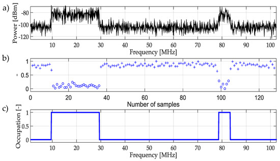 The result of this whole process is shown in Figure 7. First, in Figure 7a a real random multiband signal is presented, this signal is just an example to demonstrate the functionality of the methodology. Figure 7b shows the classification of the approximation coefficients using the NN. Here, it is possible to appreciate the difference between coefficients associated with PU and noise. Finally, in Figure 7c the result of the determination of the availability of a bandwidth space is indicated. In this figure, it is clear how the trained NN classifies the spectrum signal is occupied or empty.