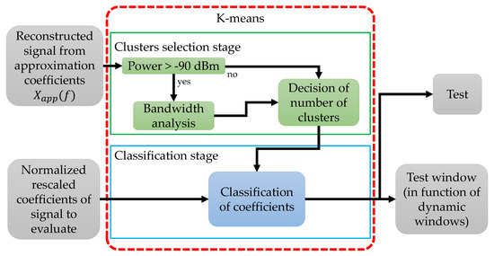 Another unsupervised method used in this work as a classifier of the approximation coefficients from a random multiband spectrum is the K-means technique. In order to determine the multiband availability of the spectrum signal, the approximation coefficients, normalized and rescaled, are first classified with K-means. The flowchart of this process is shown in Figure 13.