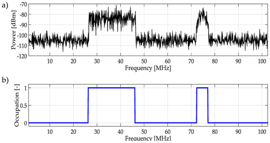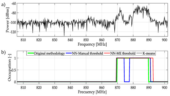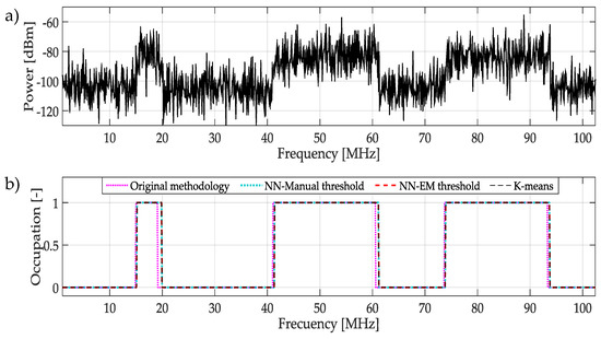(a) A real signal obtained from the frequency band [698–806] MHz. (b) The result of applying the four proposed methodologies to the real signal in terms of spectrum occupancy.