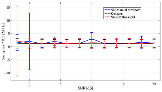 Figure 19 shows the mean and STD of the frequency edges detection as a function of the SNR for each proposed ML technique described in Section 3. Apparently, the mean of each of them tends to have the same behavior; however, the variance for each SNR differs in some of the cases. Table 3 shows the values of mean and STD, where it is possible to appreciate how for higher SNR values all ML techniques tend to similar values, being K-means the most stable method.