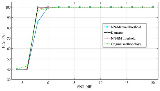 - The performance of NN with manual threshold, NN with EM threshold and K-means for SNR >= 0 have quite acceptable results, obtaining success rate practically around 100% of the correct detection.