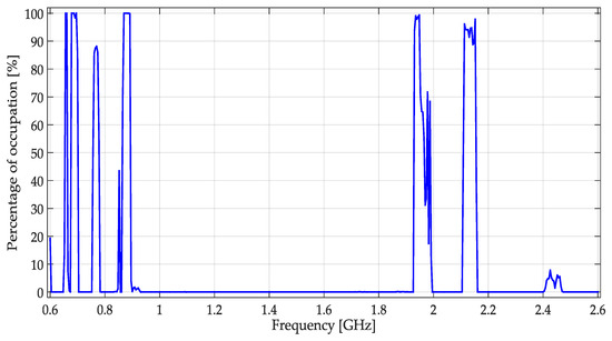 The real signals mentioned in Section 4.3 of [10] were again used to test the performance of different proposed methodologies. These signals were obtained from a whole band varying from 0.6 GHz to 2.6 GHz. The percentage of occupation in this wideband is highlighted in Figure 21. Table 4 presents the specific bands measured and for which services are they assigned.