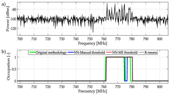 The frequencies examined from 698 MHz to 806 MHz appear in Figure 22a. This signal presents a non-constant power transmission of PUs around 760–780 MHz. In practical terms, this kind of activity determines totally occupied this bandwidth. Thus, ML techniques and the original methodology detect frequency space as occupied as can be seen in Figure 22b.
