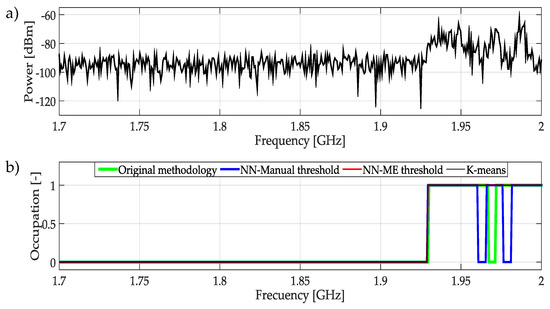 The frequencies measured from 1.7 GHz to 2 GHz are presented in Figure 24a. Here, in general, the occupied and empty bands are detected correctly by the ML techniques as can be seen in Figure 24b. However, in the range from 1.925 GHz to 2 GHz there are several transmissions. The NN with manual threshold techniques detects these changes in the occupation of the band. The frequency edges are not detected with high precision, but this technique is more sensitive to these changes.