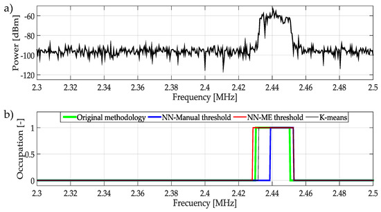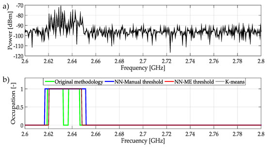 (a) A real signal obtained from the frequency band [2.6–2.8] GHz. (b) The result of applying the four methodologies to the real signal in terms of spectrum occupancy.