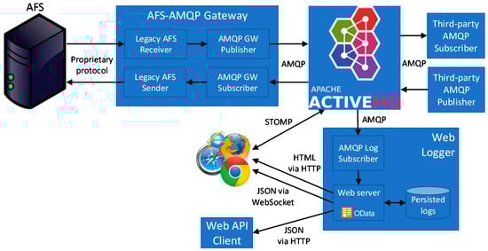 Figure 2 presents the overall architecture of the proposed solution, based on two main components: the AFS-AMQP Gateway and the Web Logger. The AFS-AMQP Gateway represents the core component, in charge of dispatching messages between the legacy AFS application and ActiveMQ acting as the AMQP publish/subscribe broker. In particular, the AFS-AMQP Gateway acts as application double gateway, hiding the legacy AFS solution and providing previously available and new features in a transparent manner. On the one hand, it supports monitoring features by receiving from AFS any ALCMS event and then publishing it to ActiveMQ in AMQP format. On the other hand, it supports actuation by subscribing to ActiveMQ to receive commands sent by third-party clients and then sending them to AFS.