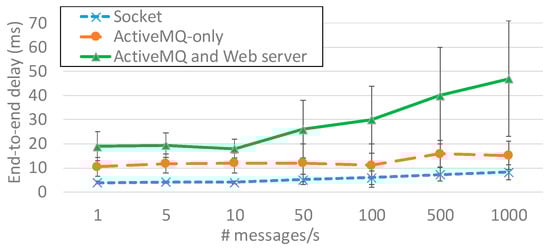 End-to-end delay average and standard deviation with socket, ActiveMQ-only, and ActiveMQ and Web server.