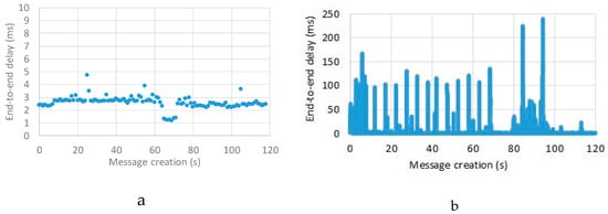 It is worth noting that at very low message frequency (1 message per second, Figure 7b) when a replica fails (at about 60 s) the end-to-end delay lowers, since the overhead due to message dispatching towards different replicas is temporarily removed. Then, the previous end-to-end delay is achieved when a new replica joins the cluster (at about 70 s). With much higher message frequency (750 messages per second, Figure 7b) the time delay variability increases, i.e., message delay more relevantly varies from message to message. In addition, delays are higher for a while right after the subscriber has switched to the active replica, since at 750 messages per second there are many messages saved in the still active broker replica (thanks to the durable subscription feature) and waiting to be dispatched to the subscriber. Then, once saved messages are delivered, the average delay stabilizes at lower values, since both the publisher and the subscriber are now connected to the same broker replica, thus avoiding inter-replica delays.
