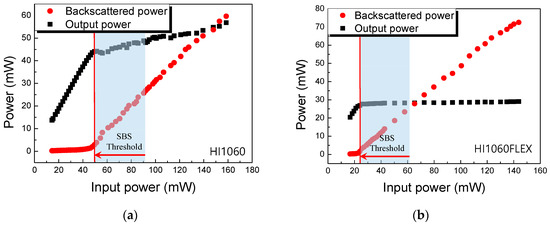 The threshold of SBS, Pth, was further measured by monitoring the backscattered optical power. The results are summarized in Figure 4. Beyond the threshold, the backscattered power linearly increased while the transmitted output power started to saturate. Pth of 50 and 24 mW was observed for HI1060 and HI1060FLEX, respectively. As expected from the fiber specifications, the Pth of HI1060FLEX was significantly lower than that of HI1060 due to the smaller effective modal area in HI1060FLEX.