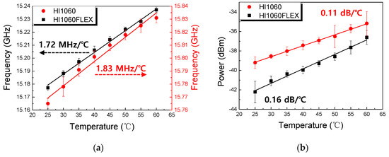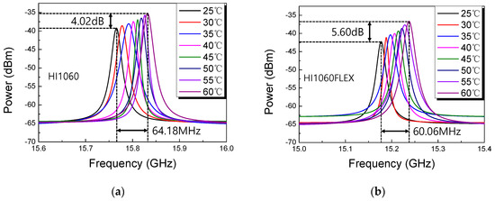 In Figure 6 the temperature-dependent Brillouin peak characteristics of 1060 nm SMFs are summarized in terms of νΒ and its peak power, which showed a good linear response with respect to temperature. In Figure 6a, the temperature-dependent Brillouin frequency shift (dνΒ/dT) of 1.83 MHz/°C and 1.72 MHz/°C were obtained in HI1060 and HI1060FLEX, respectively. The corresponding peak power changes (dIpeak/dT) were 0.11 dB/°C and 0.16 dB/°C.