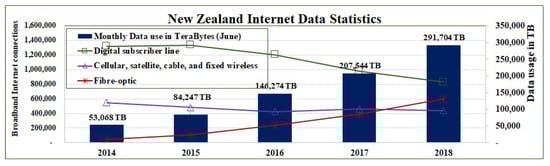 Like rest of the world, the data demands in New Zealand are increasing each year, as depicted in Figure 2. There is an increase of 40% data demand in 2018 and an increase of 54% in the number of fiber connections for faster data communication, to make up 32% of all broadband connections. On the other hand, a significant decrease of 25% is shown on the slow Internet and dial-up connections. More than 70% of all Internet broadband connections with no data limits and cap. These data demands of broadband connections include the use of 281,615,000 GB of data that is equal to 90 million hours of streaming, or 10,700 years, high definition online shows of TV. Mobile phone users consumed 10,089,000 GB data in June 2018, which is up to 56% from 2017 []. The use of mobile data has been grown by 600% in the past four years and the expected growth for the next four years is 50% per year [].