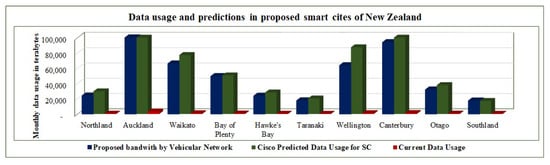 Cisco predicts that a SC with a populace of 1 million could produce 180 million GB data volume for each day or 42.3 ZB/month []. If we assume NZ main cities as smart cities, where data sources of different applications of smart cities like smart buildings, smart water, smart public services, smart lighting, smart mobility, smart waste management, smart meters, smart energy, smart sensors, and smart grids etc., will generate a massive volume of data and we need to transmit this big-data to data cloud, data centers or data control units. These expected data demands of 724 PB per day, will exceed the data usage beyond the available limit of existing infrastructure. There will be a massive gap between existing data usage and required data usage of these cities, as shown in Figure 3.