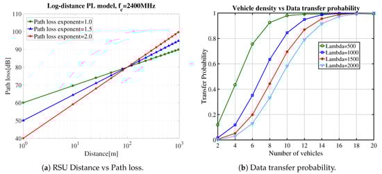 Effective distance: To calculate the effective distance, we set reference distance m and carrier GHz and apply the different path loss exponent values, according to Equation (2). The relationship between path loss [dB] and distance is shown in Figure 5a. Path loss increases with the distance between vehicle and RSU and approaches to 80 dB for 50 to 100 m. For the remaining analysis we set effective distance d = 100 m.