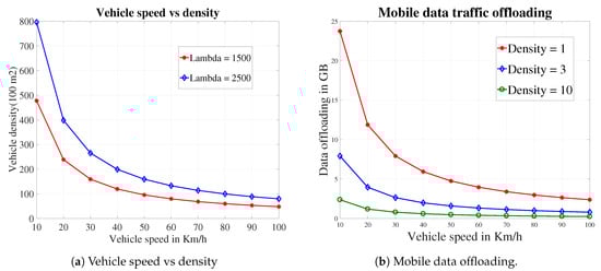 Degree of data offloading: By considering the above evaluation, the data offloading can be calculated by using Equation (7) in the wireless coverage area of an RSU. According to Figure 5a, we set the effective distance of the vehicle from RSU , and we set the transmission probability = 0.95 according to Figure 5b. A vehicle can transfer various amount of data to RSU by using different speeds. The time in which a vehicle stayed connected with an RSU is inversely proportional to vehicle speed. According to Equation (7), the data transfer rate varies with the different speeds of vehicle and connection time duration of a vehicle decreases with increase in the speed of the vehicle. Moreover, Figure 6b, shows that if we increase the vehicle density, i.e., there are more vehicles that want to send the data then the bandwidth will be divided among all vehicles.