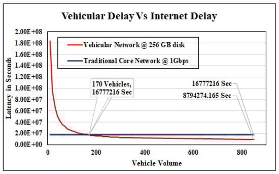 The proposed case of Auckland City is shown in Figure 7. We propose two cases for delay-tolerant information transmission, the core network, and the vehicle transport network. Assume a source at SH16 Royal Rd Off Ramp to Hobsonville Rd/SH18 Off Ramp WB with reference ID:01610016 in Auckland City needs to send some delay-tolerant data to a destination in the city center. For the vehicular system, we find the distance d between these two points is 23 Km by using Google maps and vehicle count on the said link is 27857 []. The average speed of the vehicle on this link is 50 Km/h. Assume each vehicle has IEEE 802.11ay wireless interface and disk capacity is 256 GB. We assume that if only 20% () drivers take part in this proposed framework, then by applying Equation (14) we can estimate the delay value of the proposed network. In the core network case, a cellular network, a wired network, or a wireless network can be used for data forwarding, and its delay can be estimated by using the Equation (18). We exchange the different information volume between these two locations and get the outcomes as appeared in Figure 8a. For comparisons, we use the bandwidth 512 Mbps and 1 Gbps in traditional core network case. The outcome demonstrates that our proposed vehicular network outperforms the traditional core network. We enhance the data size and look at its impact on delay for data transmission. The results demonstrate that for huge information volume, the delay increases significantly for core networks as compared to our proposed vehicular network.