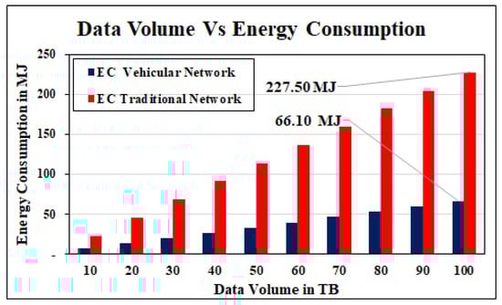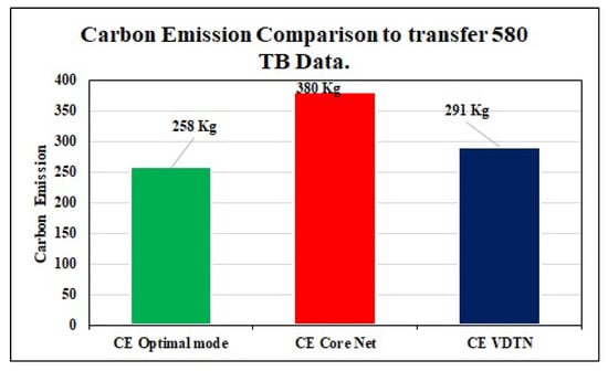 By applying energy-efficient network mode selection, we can further reduce the energy cost and carbon consumption. Information exchange for both core network and VDTN consumes energy from various means like fuel and power. This usage of energy transmits carbon into the environment. Figure 13 demonstrates that the CE, is less for our proposed optimal model as compared to traditional core networks and VDTN. To evaluate these outcomes, we used the carbon emission 0.703 Kg/kWh [] and the conversion unit 1 MJ = 0.2777778 kWh [].