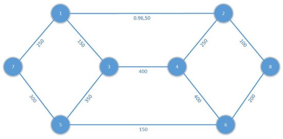In this case scenario, we proposed a solution, where a road network is investigated for data transfer assignments as shown in Figure 11. Here, nodes represent the data offloading locations and links represent the roads. Each road has the traffic count as the capacity of the road. We use an embedded storage device of weight 0.95 Kg in the vehicle and calculate the energy cost to transfer 1TB of data for each road. In these calculations, we use Toyota Prius as a relaying vehicle, and the value of fuel constant is assumed as Cfuel = 37,624,722.29 J/L [] in Equation (21). These calculations are presented in Table 3. For each offloading request; we apply our Algorithm 1 to find the best route by solving the data transfer assignment as a traditional multi-commodity flow problem.