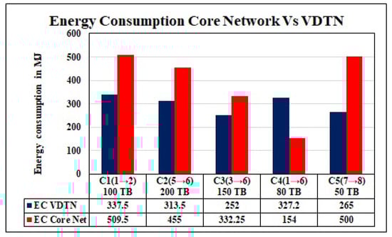 By using this multi-commodity flow model and our energy cost model, we evaluate the EC cost for a given set of five commodities (Figure 12) of delay-tolerant data, with a total data flow of 580 TB. We execute Algorithm 1 on SaS optimization tool [] to find a set P of energy-efficient paths and optimal solutions for a given set of commodities to transfer data by using road network. To calculate the EC of the traditional core network, we use graph by applying Equation (24), and unit cost for EC to transfer a data demand on each edge in MJ/TB is calculated in Table 4. Calculated results for the core network and VDTN are shown in Figure 12. It shows that our proposed data transport model outperforms the traditional core network, for all the commodities other than the commodity number 4. In this case the distance between the data source and destination is high. That is why vehicles consume more energy to transfer data at the final destination. Moreover, for this demand, a huge amount of energy is also consumed at intermediate nodes for data offloading from vehicle to intermediate nodes and uploading from intermediate nodes to vehicles. To transfer 580 TB data, the traditional core network consumes 1950 MJ energy, and our proposed vehicular network consumes 1495 MJ energy. In this way, our proposed vehicular network can save up to 24% of energy costs for these data assignments.