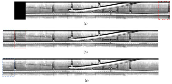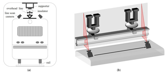 Figure 1a shows a front view of the vehicle in an underground tunnel. A line scan camera is installed on the top of the railroad vehicle in the orthogonal direction to the vehicle’s moving direction. As shown in