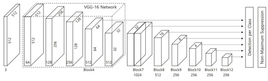 Figure 6b. Although it enables a quick detection performance, the accuracy decreases due to the reduced number of parameters. More specifically, the accuracy in detecting small objects rapidly decreases since the relatively shallow network loses features in a small object. To improve that drawback, we introduced additional blocks derived from the deconvolutional SSD proposed by Fu et al. [