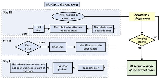 Figure 1 shows a flowchart that synthesises the whole scanning process. Three colours are assigned in order to distinguish between the main modules of the approach: data acquisition (yellow), 3D modelling (green) and moving MoPAD to a contiguous room (blue). As mentioned in Section 1, this paper specifically deals with the last module. Complete information on the first and second modules can be found in references [20,21]. It is necessary to follow three consecutive steps to complete the action “moving MoPAD to the next room”. In step I (see Section 3), MoPAD stops scanning, identifies the exit-door, recognizes the state of the door, moves towards the exit-door and places itself in front of it. In step II (see Section 4), and if the door is closed, the handle of the door is recognized and positioned by processing a new selective and dense scan of the door. In the third step (see Section 5), MoPAD opens the door and passes through it to the next room. In the case of an open door, steps II and III are simplified, and MoPAD merely has to pass through the doorframe.
