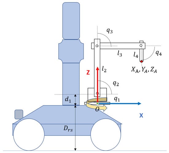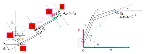 In this phase, the mobile robot is placed in front of the door with door coordinates , where is a constant value in this phase, and . The end-effector of the robot is initially placed at a vertical distance h above point A and then moved along the Z axis until it reaches the height of the handle. The equations of the end-effector in the frame (at this moment) are, therefore: