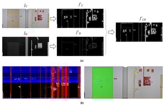 (a) Orthoimage separated into colour and depth components, and the combined discontinuity image . (b) Horizontal and vertical lines detected and the recognized door (highlighted in green).