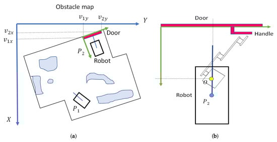 (a) Representation on the world coordinate system. Obstacle map and initial and final positions of the robot. (b) Position and orientation of the robot in front of the door.