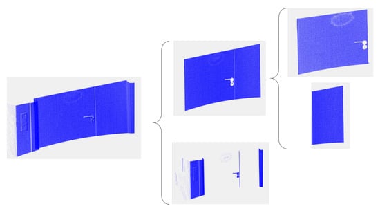 - Stage I: Calculation of the door’s plane and its associated points. First, the point cloud is segmented into two parts: one segment corresponds to the points belonging to the door and the other contains the remaining points. The segmentation is carried out by using the MLSAC method, which provides two planes, and , corresponding to both segments.
