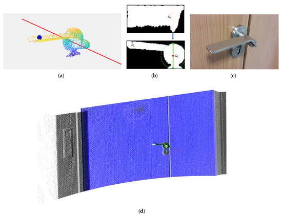 Figure 7. (a) Points corresponding to the door handle (). The handle rotation axis and the contact point are superimposed onto . (b) (Top) Top projection of and handle rotation axis in red. (Bottom) Frontal projection of and rotation axis (red dot). (c) Picture of the door handle. (d) Fully segmented point cloud. - -