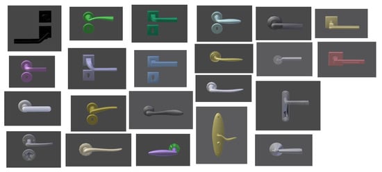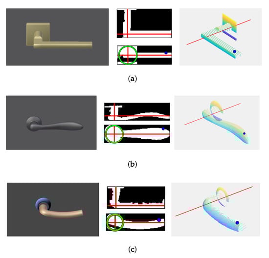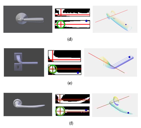 In order to demonstrate the robustness of this algorithm, extended experimentation was conducted on 22 different types of door handles (Figure 8). The algorithm successfully detected the rotation axis and the contact point in all cases. Figure 9 shows the results for some of the most representative cases.