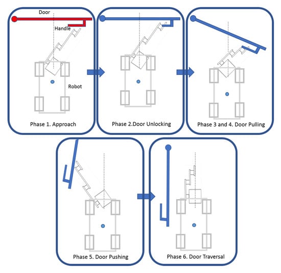 - Li, J.; Tao, J.; Ding, L.; Gao, H.; Deng, Z.; Xia, K. Twisting door handles and pulling open doors with a mobile manipulator. In Proceedings of the 2015 IEEE International Conference on Robotics and Biomimetics, IEEE-ROBIO, Zhuhai, China, 6–9 December 2015; pp. 686–691. [Google Scholar] [CrossRef]