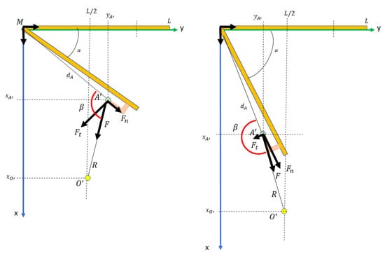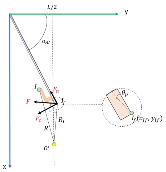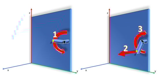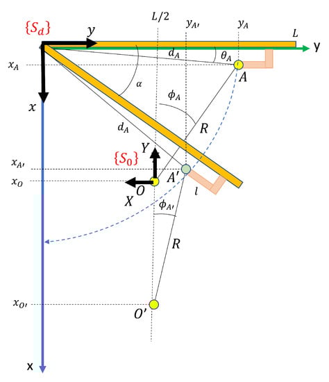 Let us assume a door of length L that is initially closed, which has a handle of length l with a contact point A of coordinates with respect to the door frame . As is shown in Section 3, our system processes the 3D point cloud taken by the scanner in front of the door and calculates coordinates in the frame . The polar coordinates of A are: