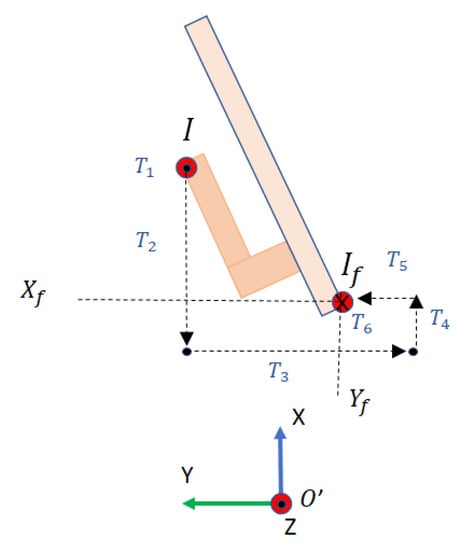 The coordinates of the end-effector with respect to the robot system are in Equations (22)–(24), now for .